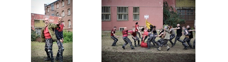 Diesen Stoff nahm sich Regisseur Peter Atanassow als ein Lehrstück über das so häufige Scheitern des Sich-Wehrens einer unterdrückten Volksgruppe gegen eine technische Übermacht vor und inszenierte es mit dem Erwachsenen-Team des AufBruch-Gefängnistheaters im alten Innenhof der JVA Tegel. Dort umstehen drei alte leerstehende Gefängnishaus – Längsfronten in einer düsteren Kulisse aus dem 19. Jahrhundert die Handlung, wie in einem Film. Das Stück: „Hermanns Schlacht“ nach Christian Dietrich Grabbe zeigt arrogante, gebildete, städtische Umgebung gewohnte Römer (mit roten Schulterkappen) und verzweifelte, starke, wald-bäuerische Umgebung gewohnte (mit unterschiedlichen Pelzen behangene) Germanen. Hart geht es zu und unerbittlich. Auf beiden Seiten, Gewalt verroht, das wird klar. Das Besondere: Parallelen werden gezogen: Zu Beginn ein eindrucksvoller Monolog. Ein Mann mit schwarzer Hautfarbe deklamiert Worte des Patrice Lumumba: „Die Gringos sagen nicht die Wahrheit…wir können sie verjagen…Alle Menschen wurden von demselben Geist geschaffen… alle Menschen sind Brüder…unser Volk stirbt…um uns zu schützen, müssen wir kämpfen“